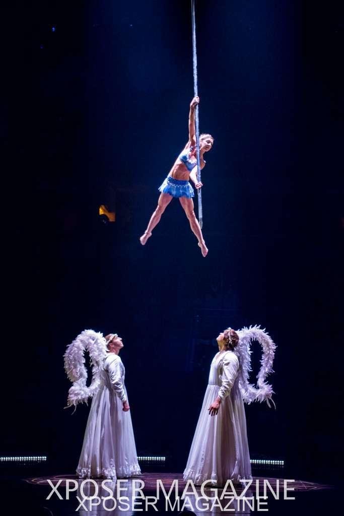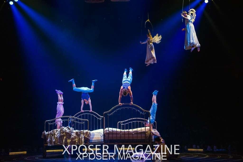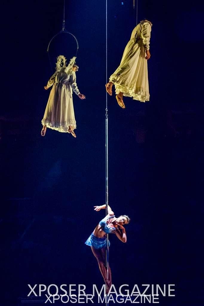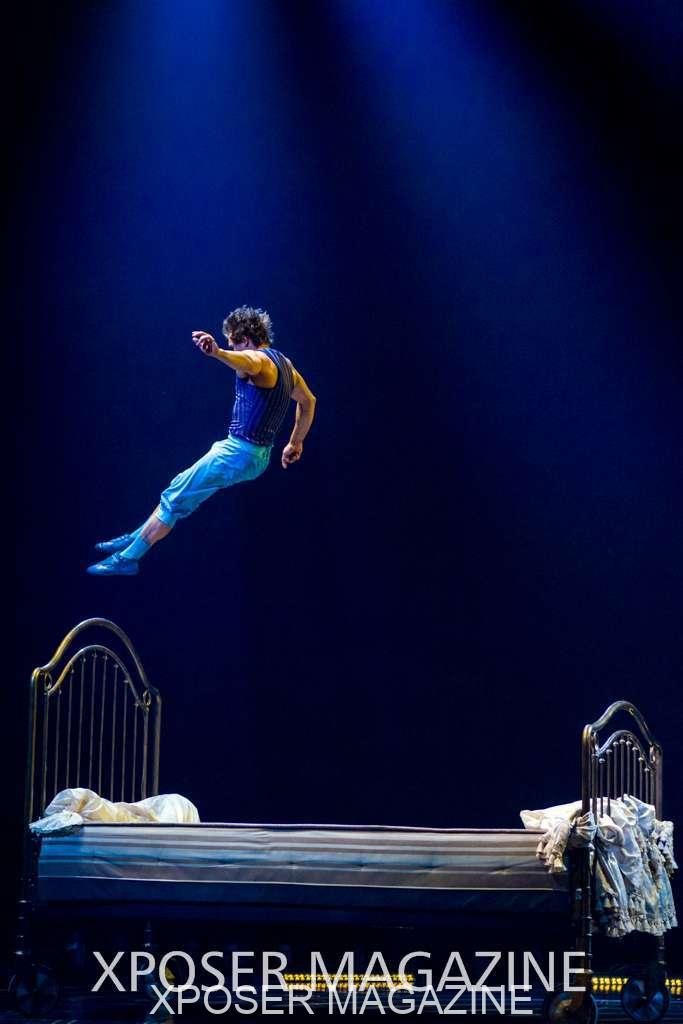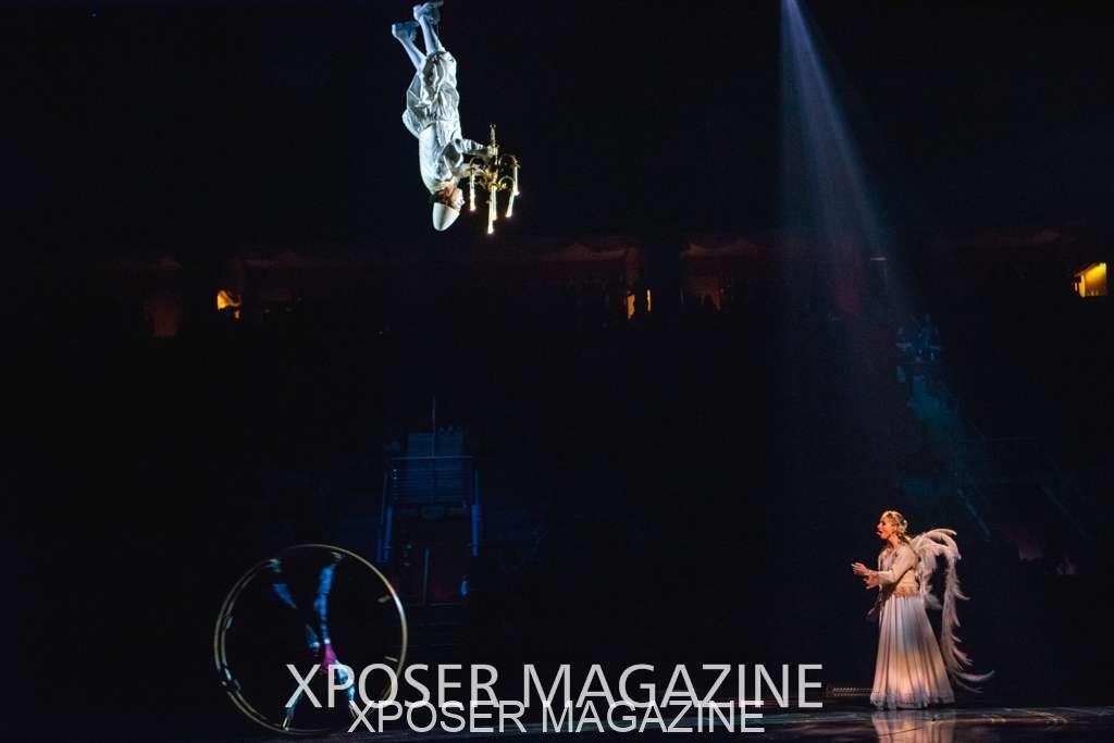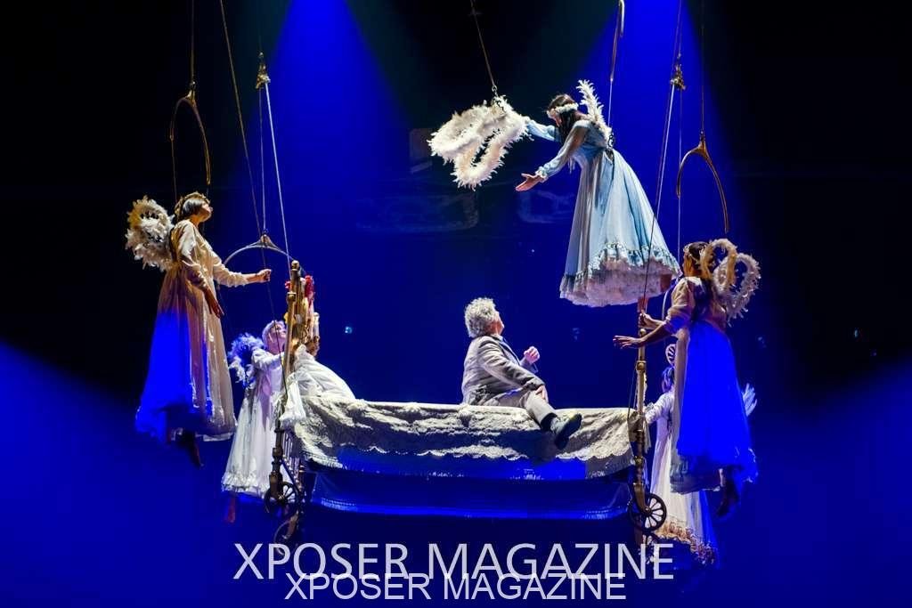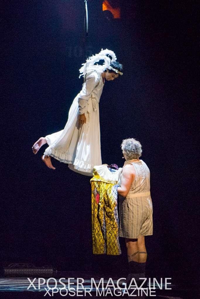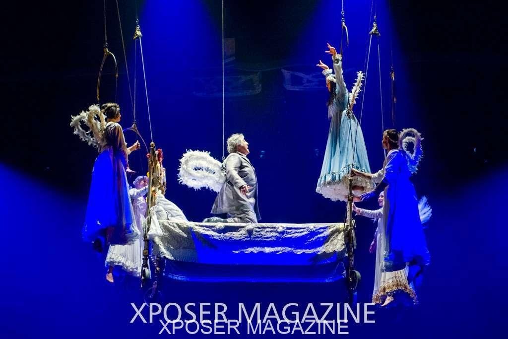 The angels float back in and hover above the clowns’ bed preparing him for the next round of his journey; this is when the Cyr Wheels enter the scene. Performing amazing acrobatic maneuvers, the cyr wheel artists give a great fluidity to the movement on stage.