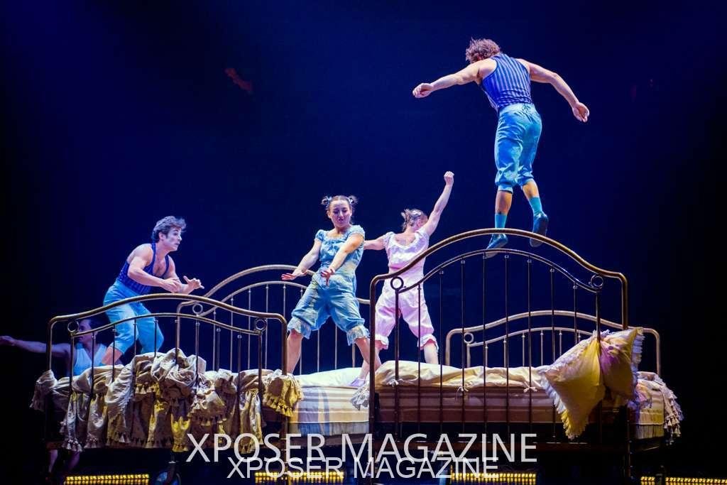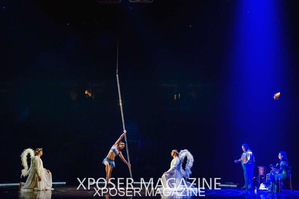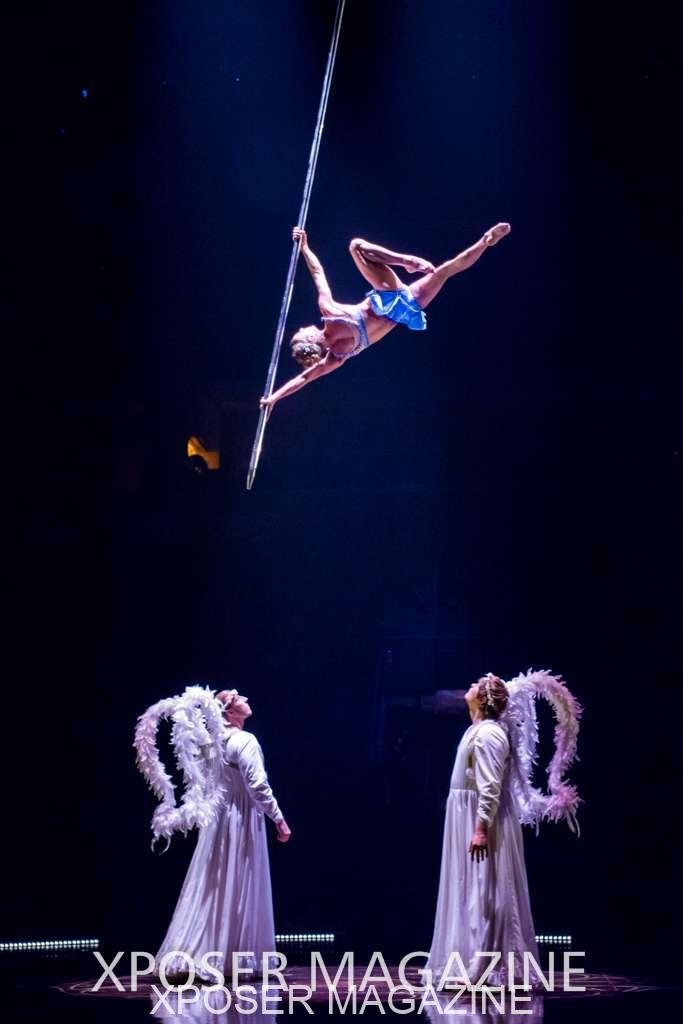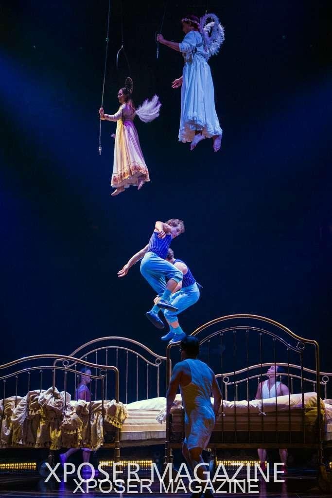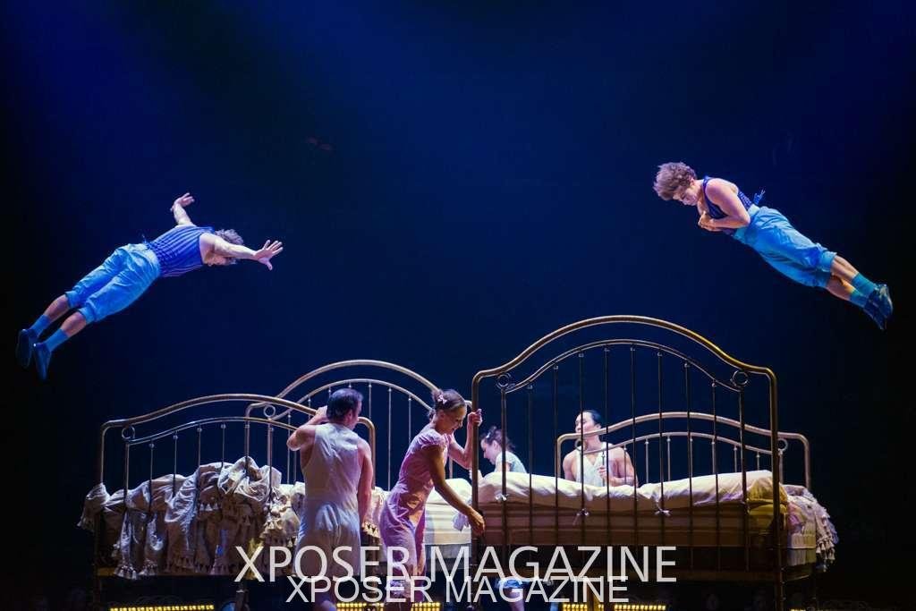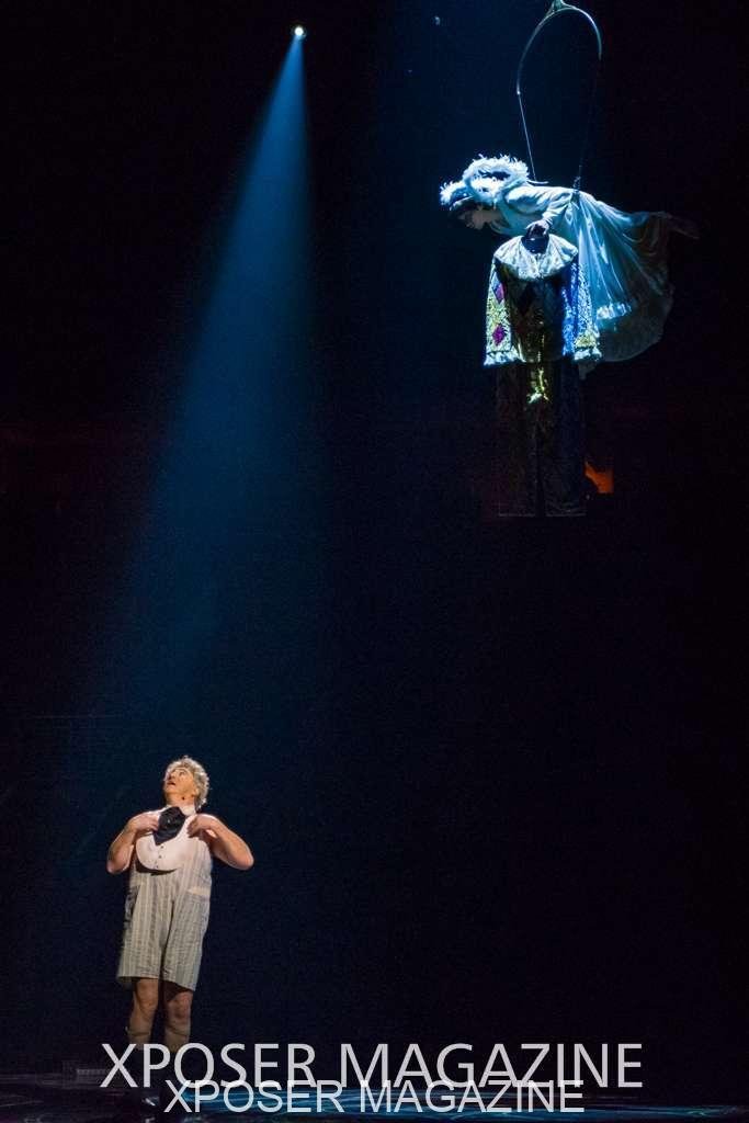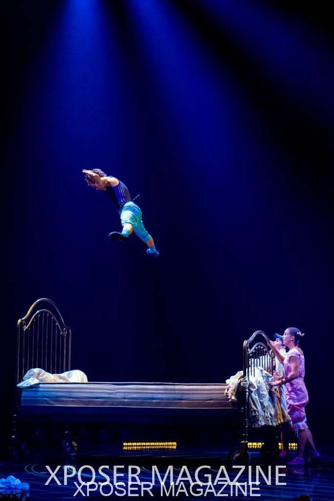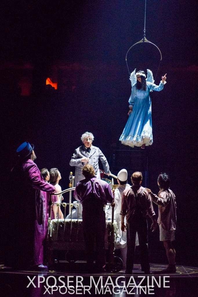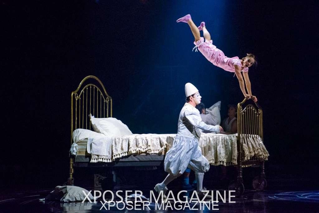 The angels float back in and hover above the clowns’ bed preparing him for the next round of his journey; this is when the Cyr Wheels enter the scene. Performing amazing acrobatic maneuvers, the cyr wheel artists give a great fluidity to the movement on stage.