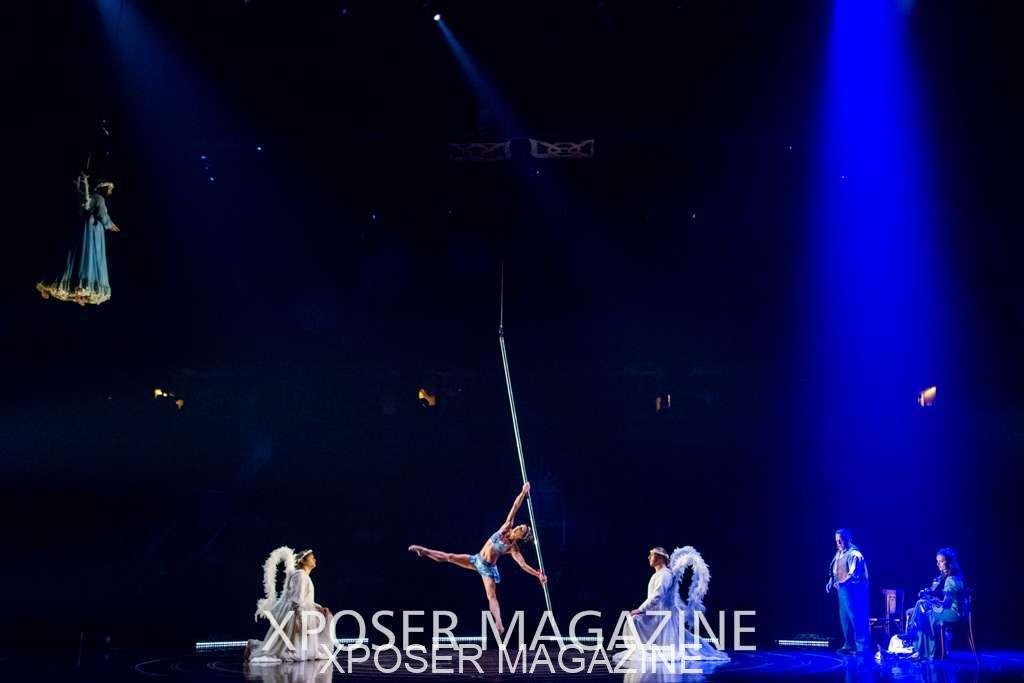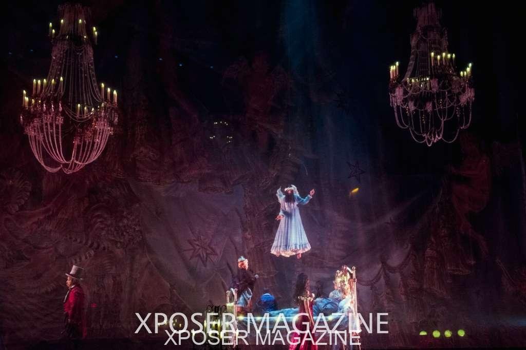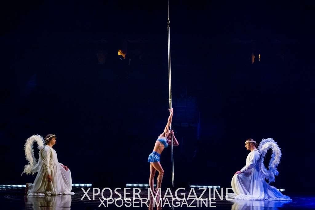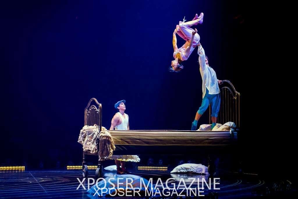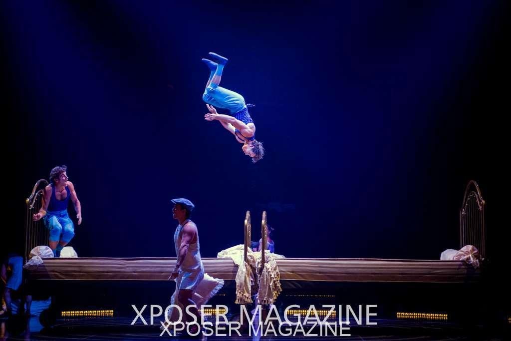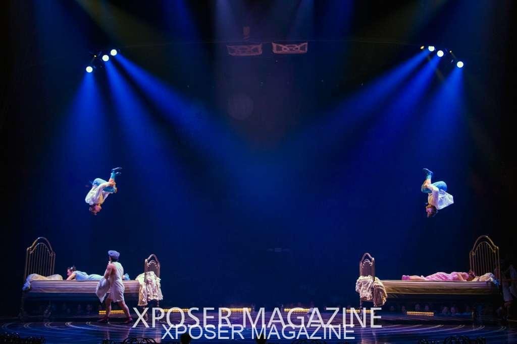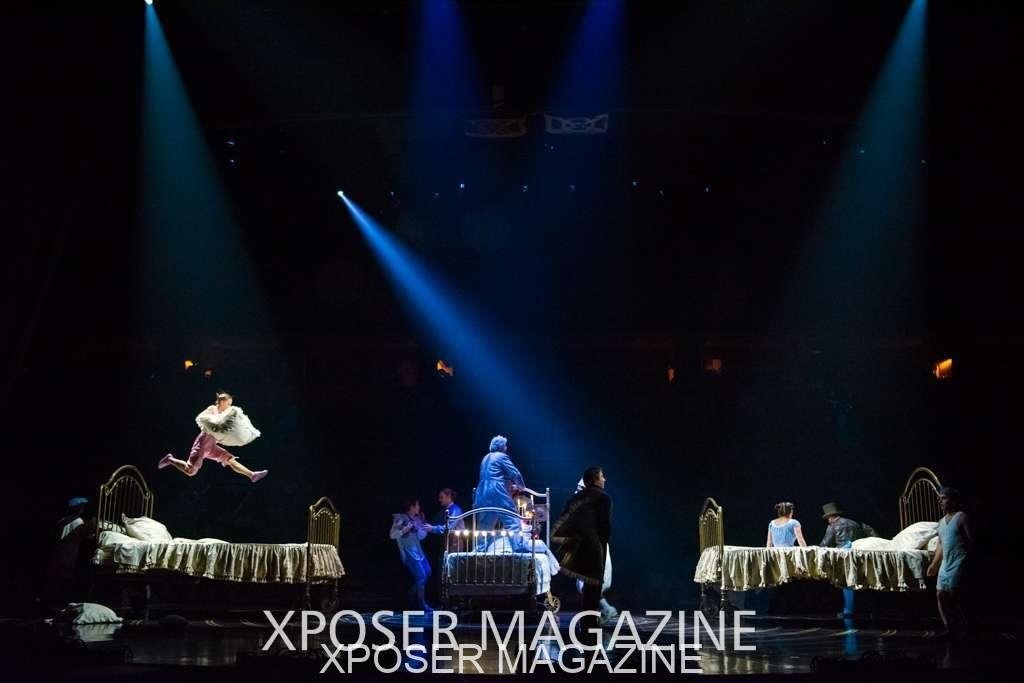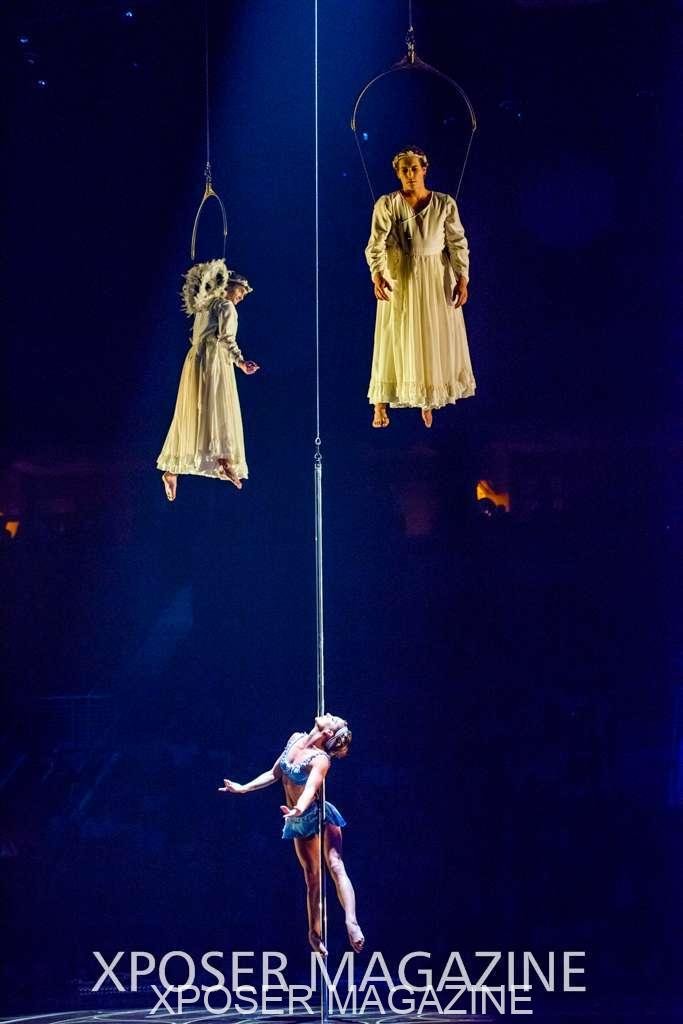 The angels float back in and hover above the clowns’ bed preparing him for the next round of his journey; this is when the Cyr Wheels enter the scene. Performing amazing acrobatic maneuvers, the cyr wheel artists give a great fluidity to the movement on stage.