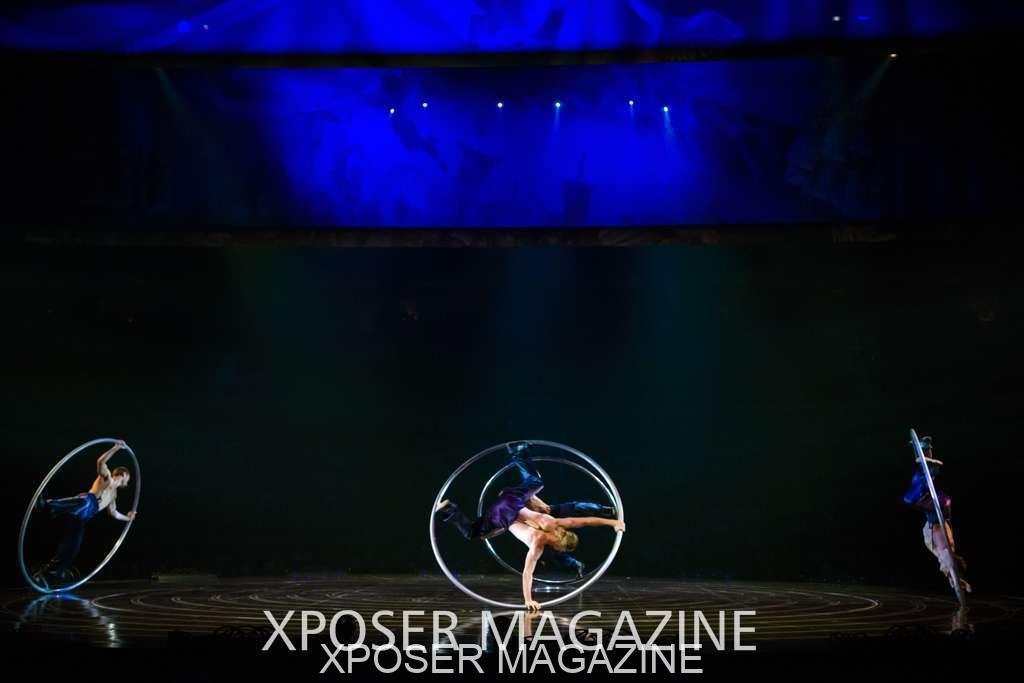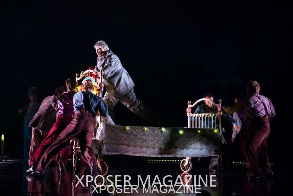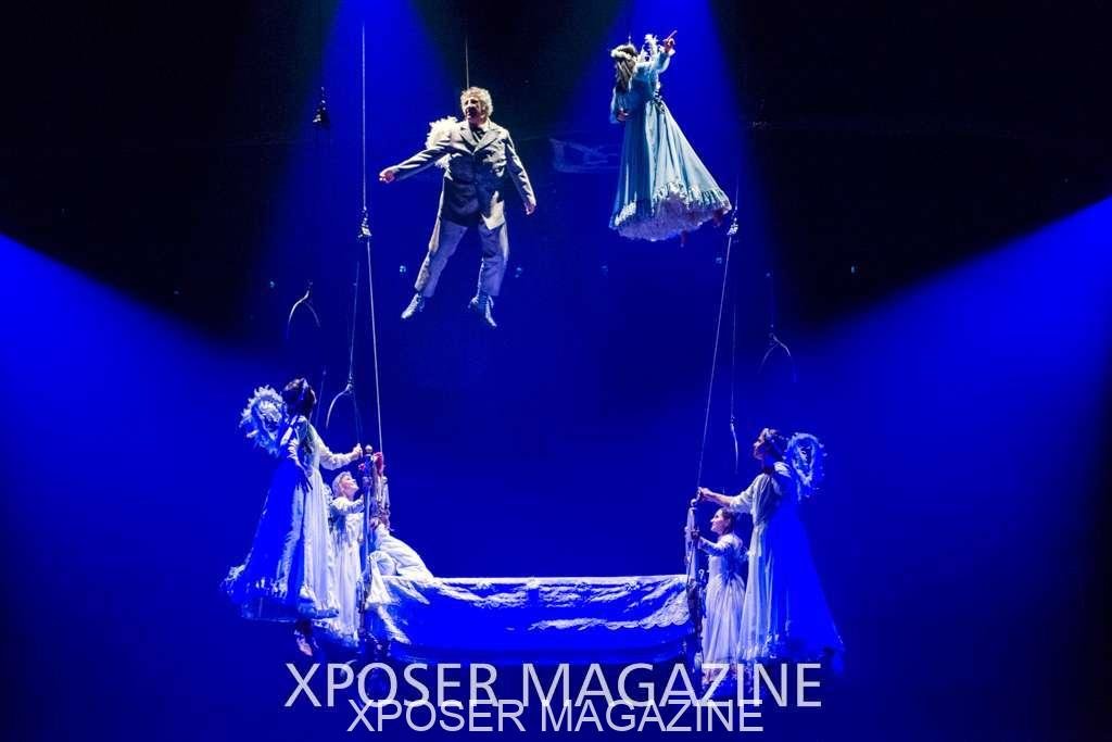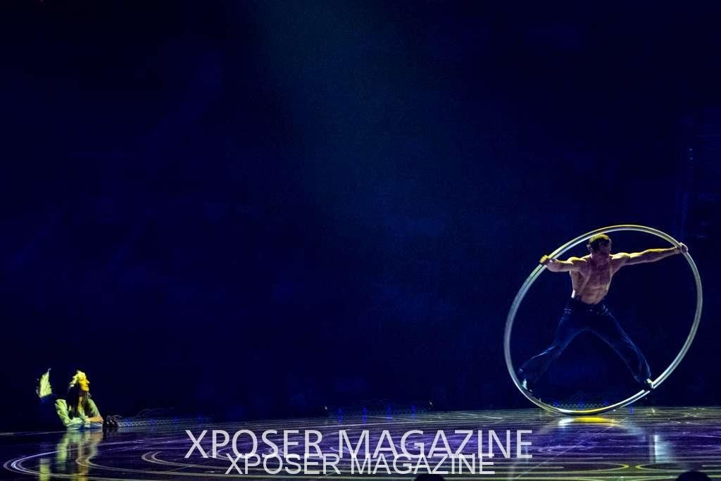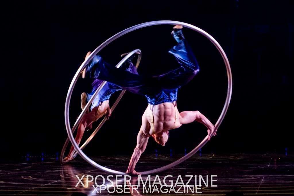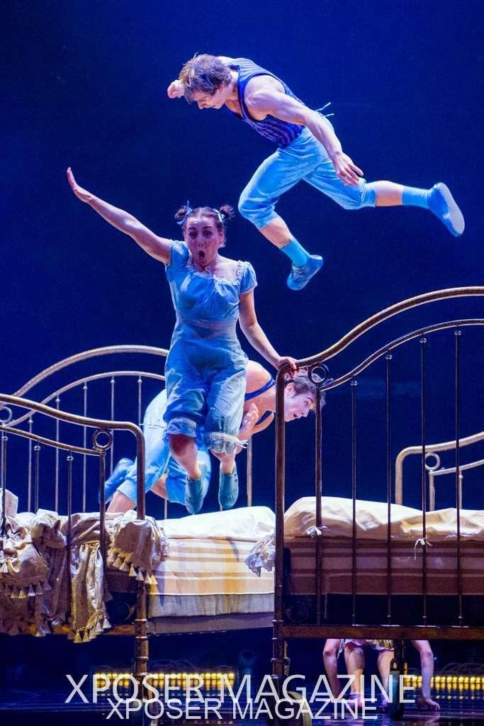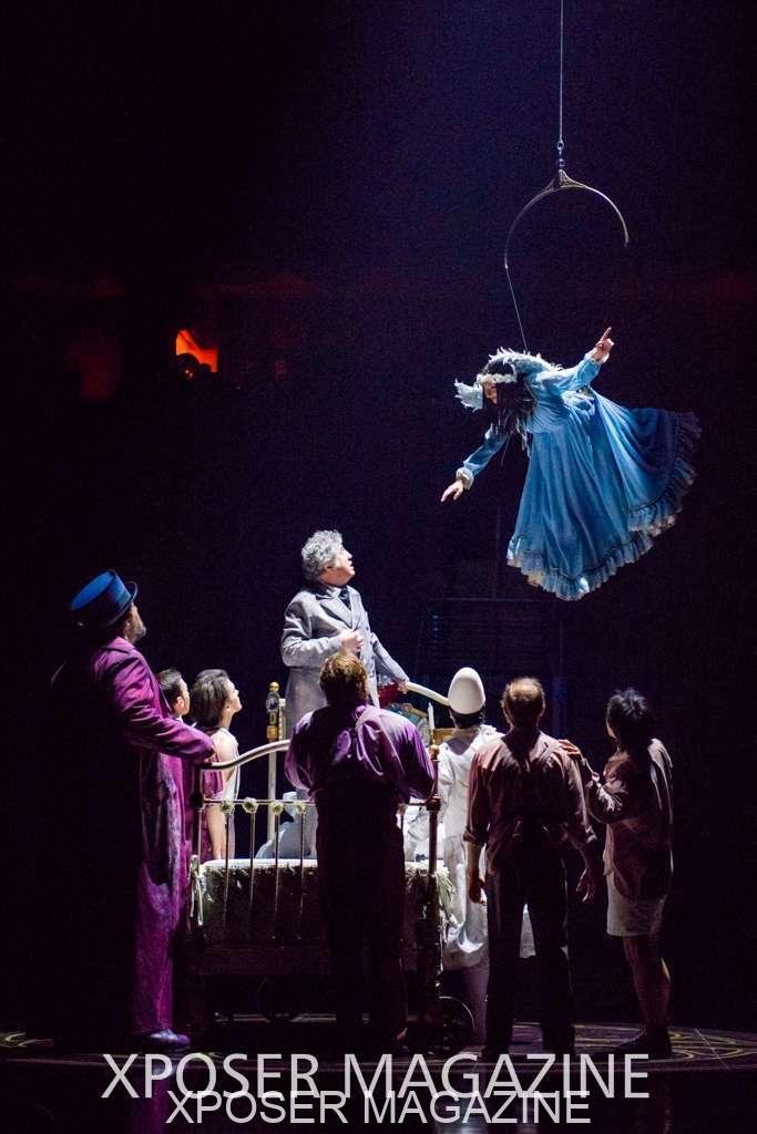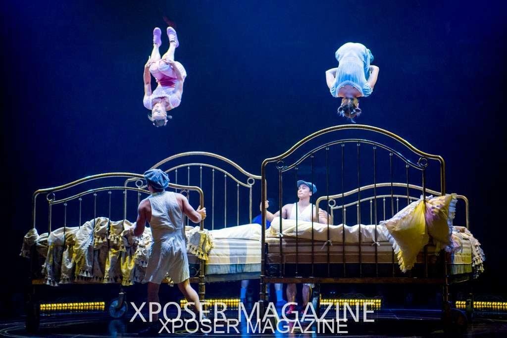The angels float back in and hover above the clowns’ bed preparing him for the next round of his journey; this is when the Cyr Wheels enter the scene. Performing amazing acrobatic maneuvers, the cyr wheel artists give a great fluidity to the movement on stage.