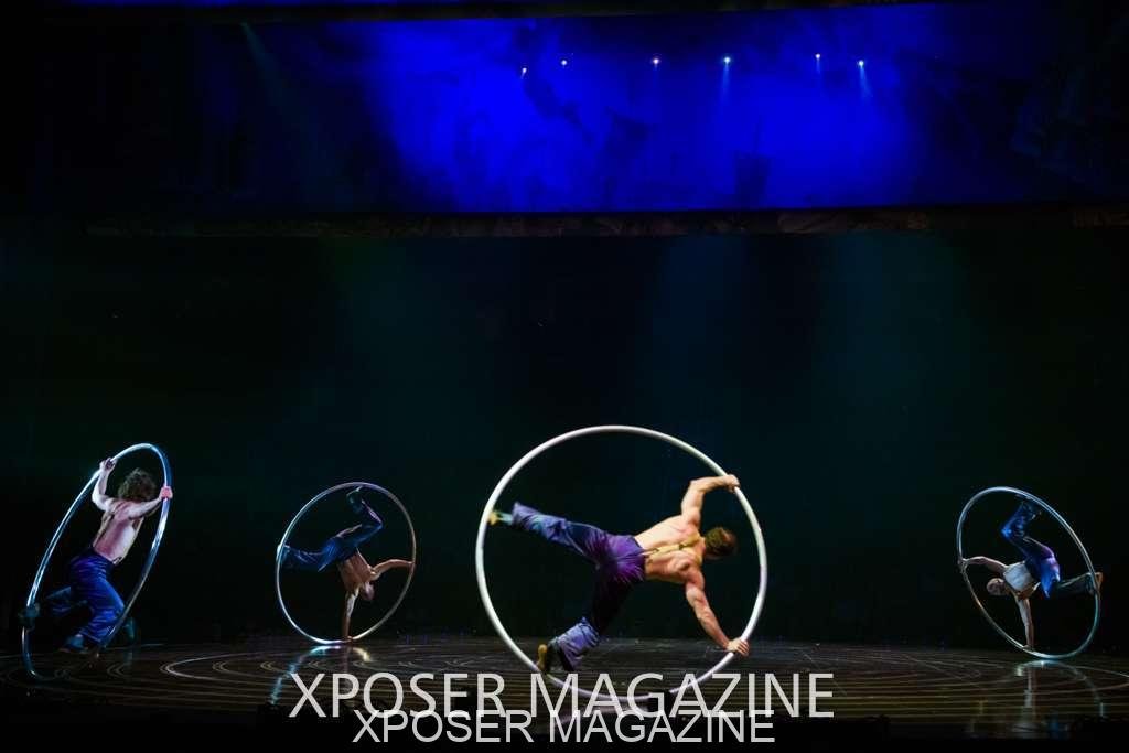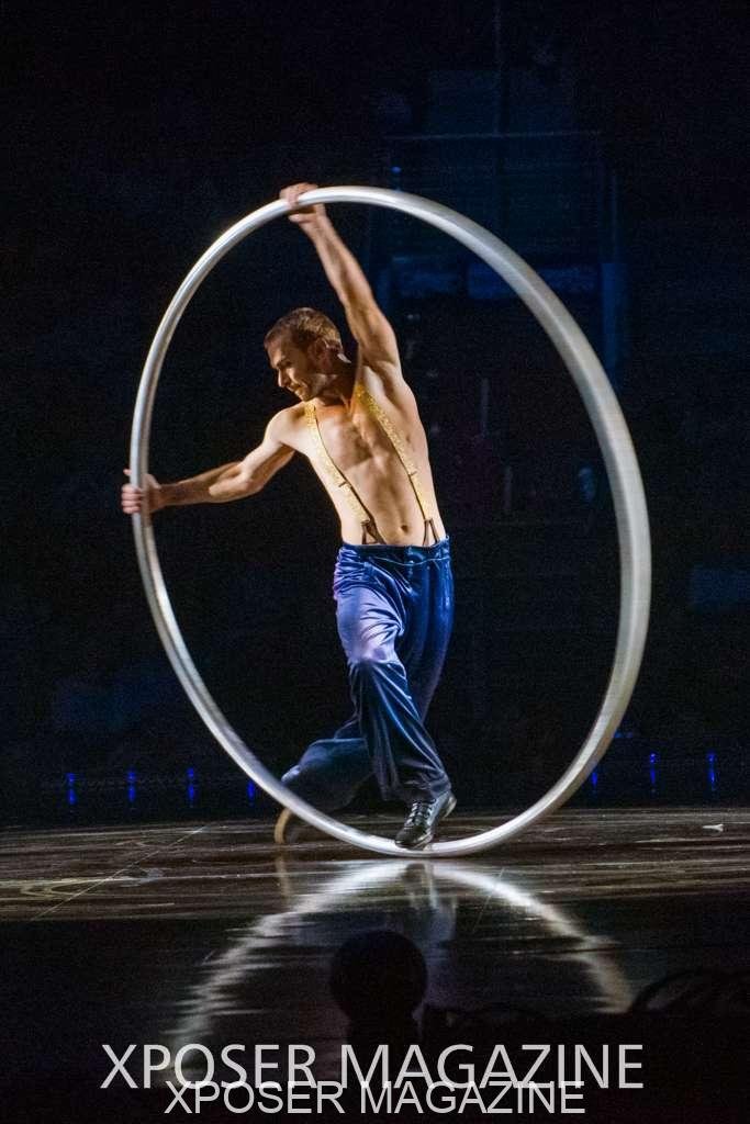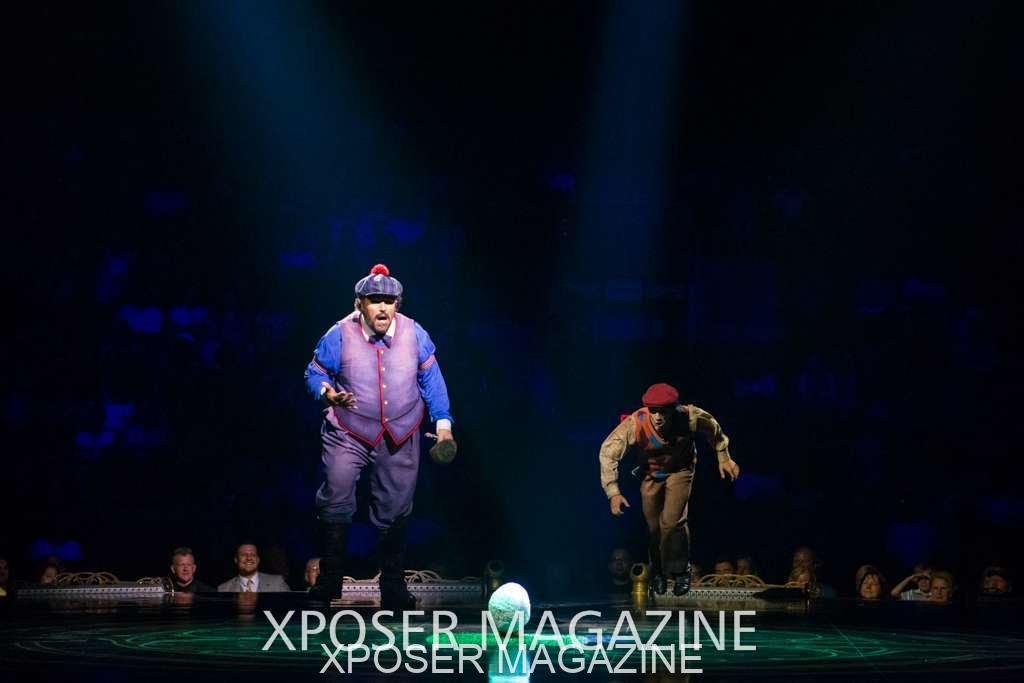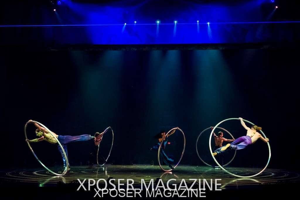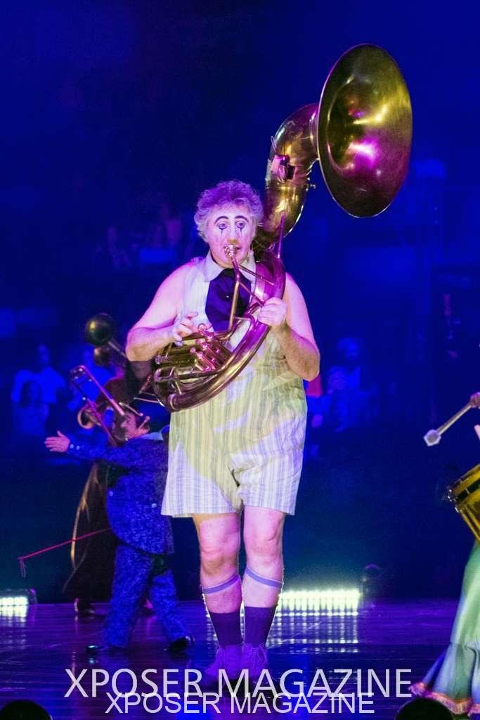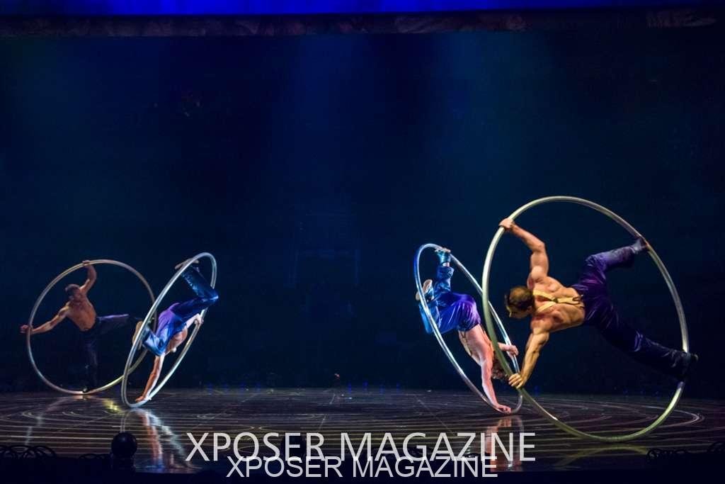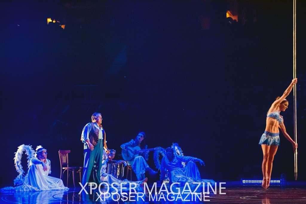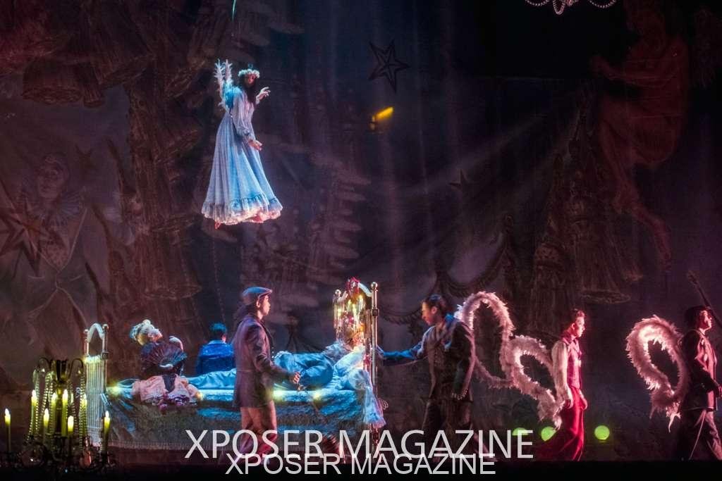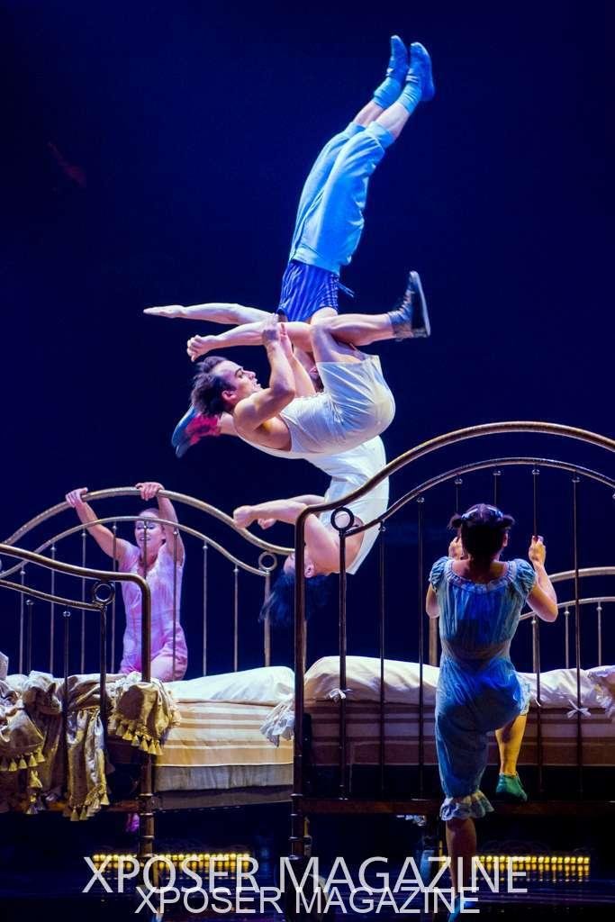 The angels float back in and hover above the clowns’ bed preparing him for the next round of his journey; this is when the Cyr Wheels enter the scene. Performing amazing acrobatic maneuvers, the cyr wheel artists give a great fluidity to the movement on stage.