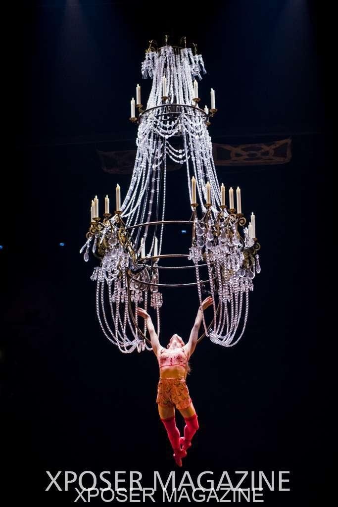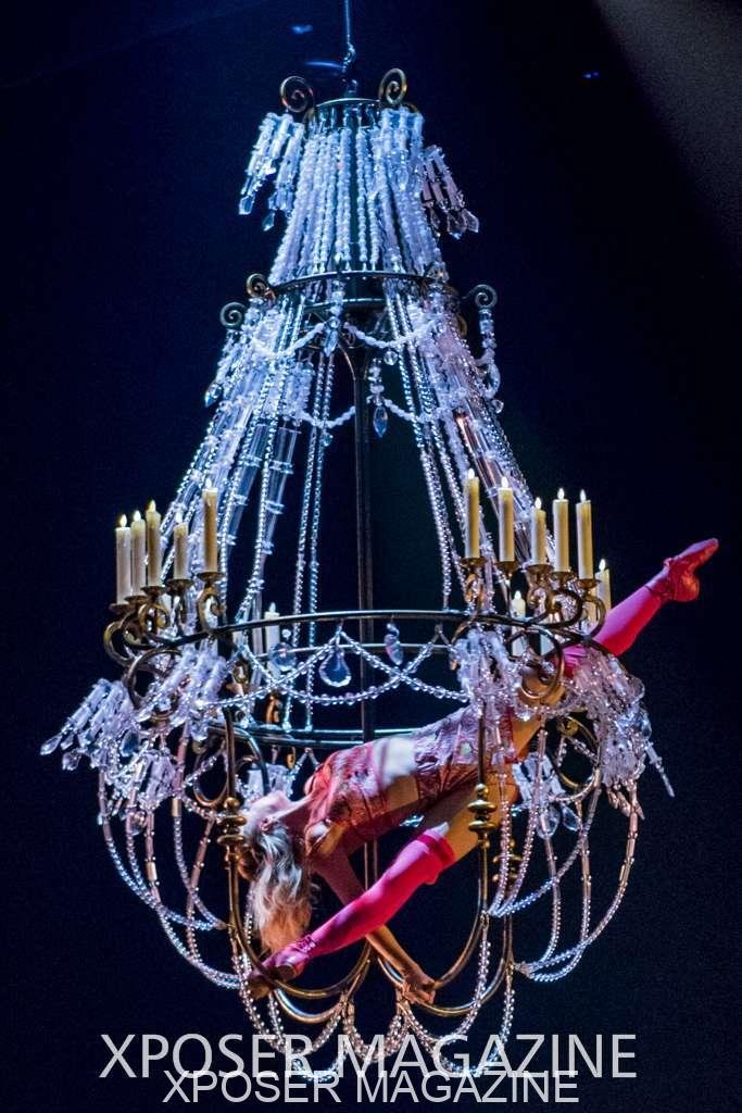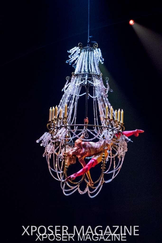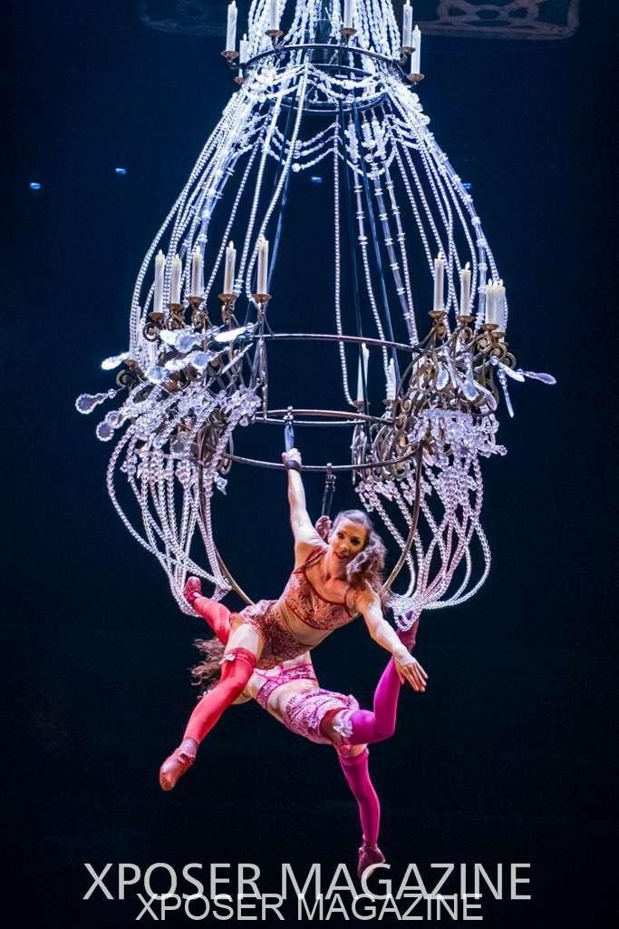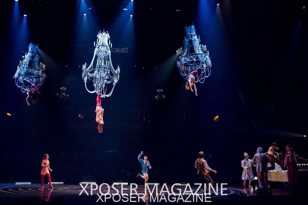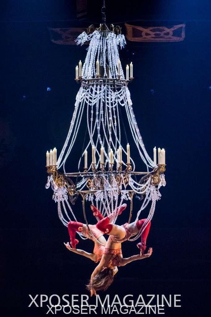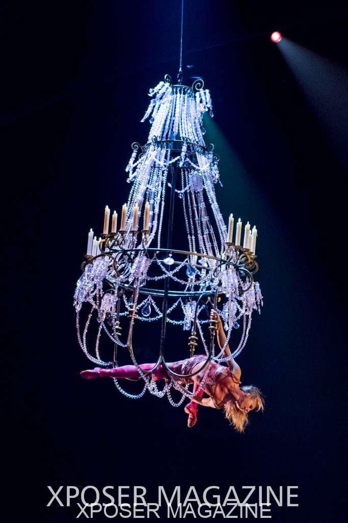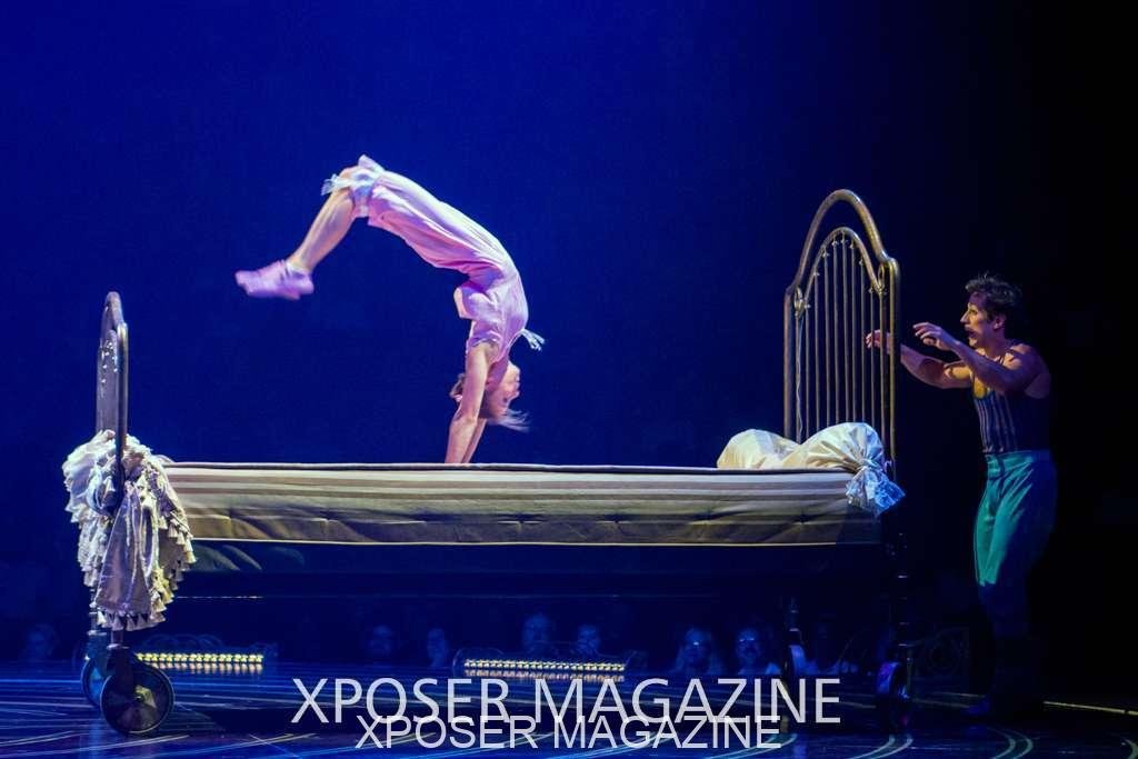 A beautiful ambiance as the curtains draw aside. The clown lays on his deathbed as he sees visions of his past, three chandeliers shimmer from the stage, each one containing a former love of his as he watches them dance from above. This then transitions to a time of his youth where he and his friends were jumping on beds, performing flips and enjoying life as only children do. These are not just ordinary beds however; each one is a specially made trampoline, which also has a hard top cover to allow the hoop artist to perform on top. Each bed weighs approx. 600lbs and there are two of these on stage tonight.