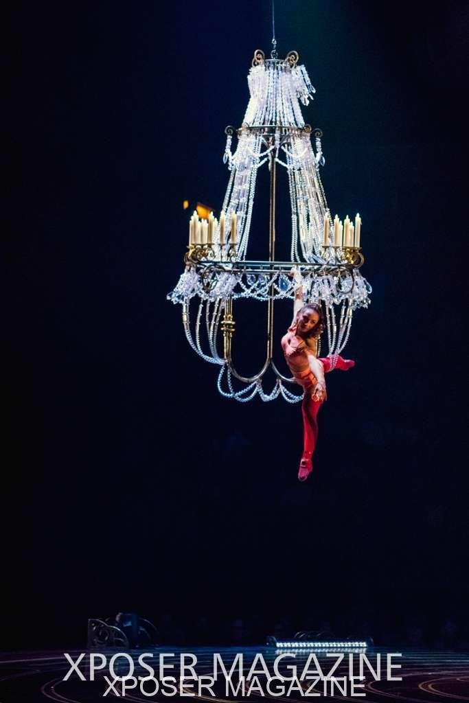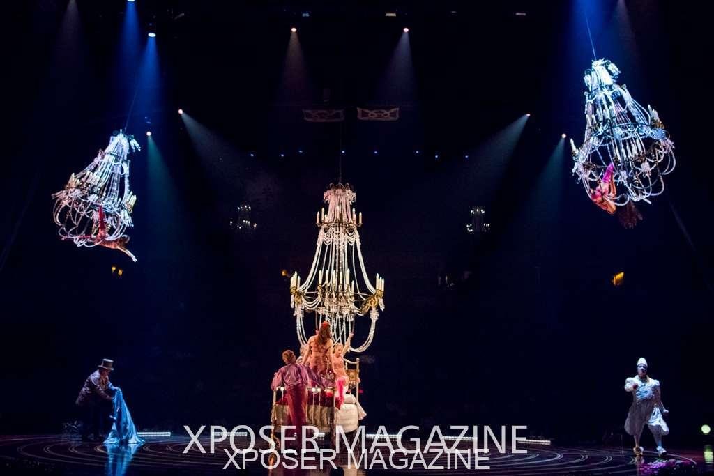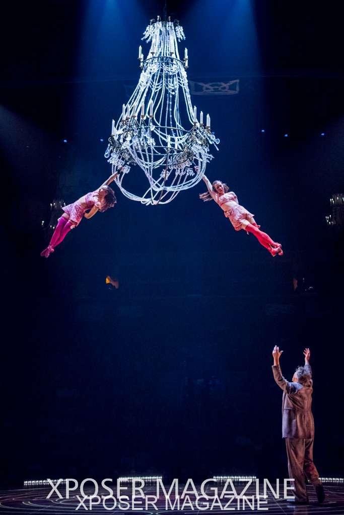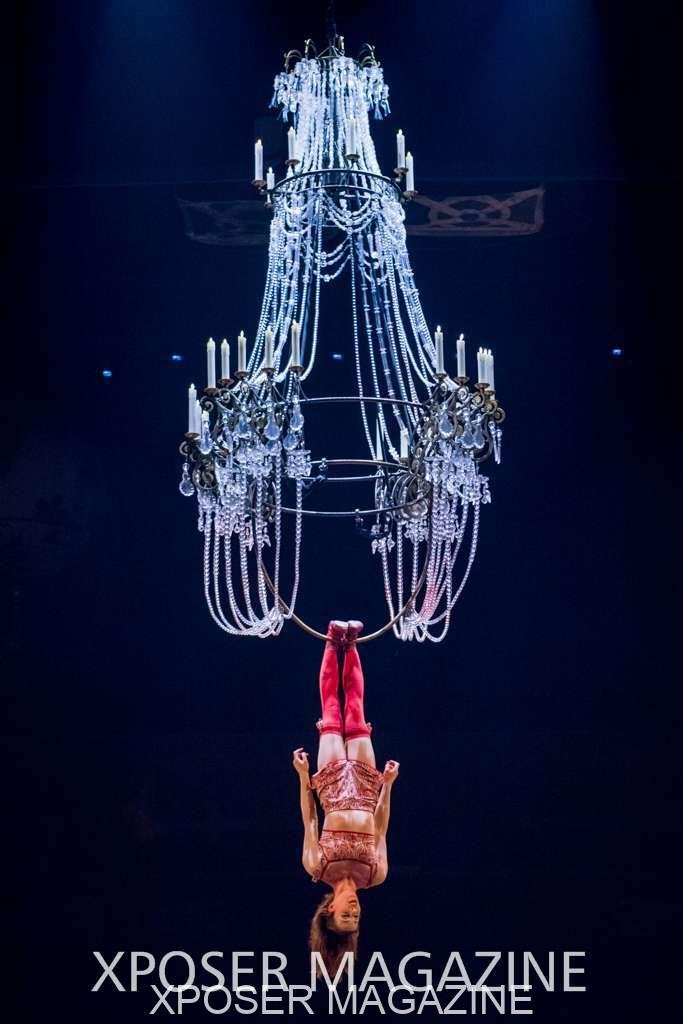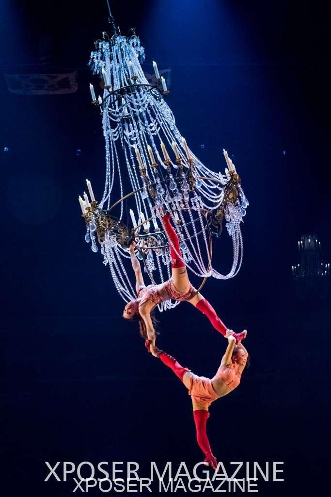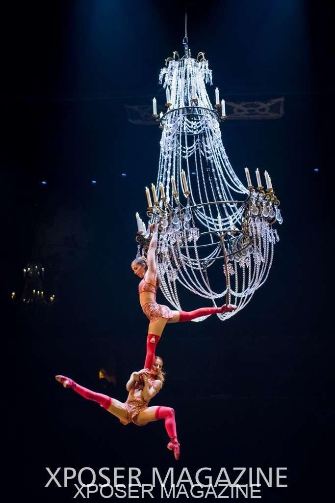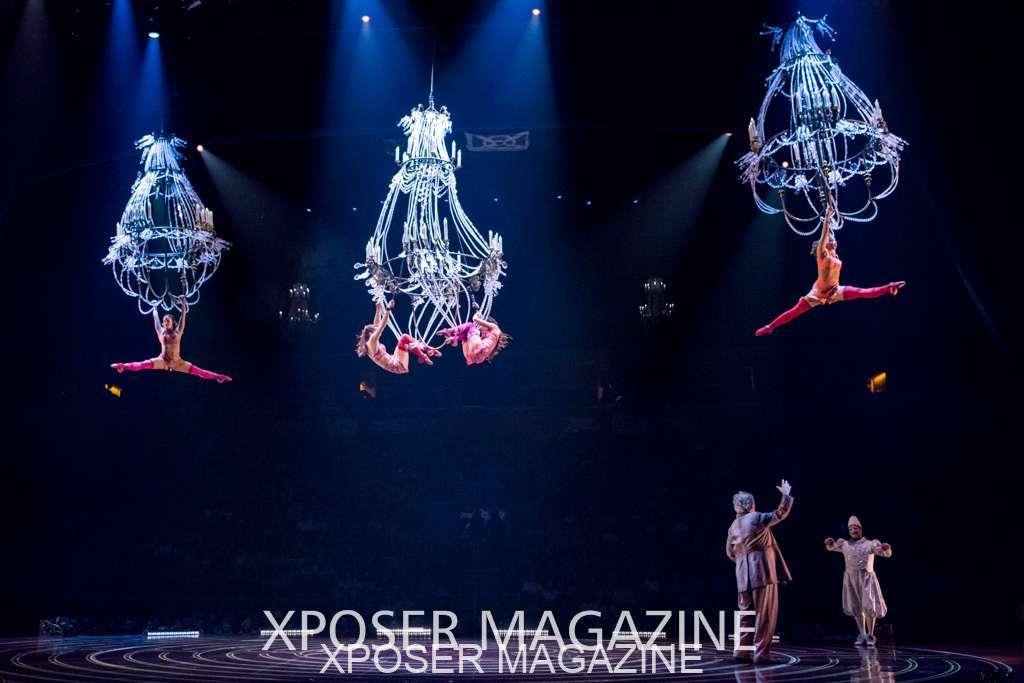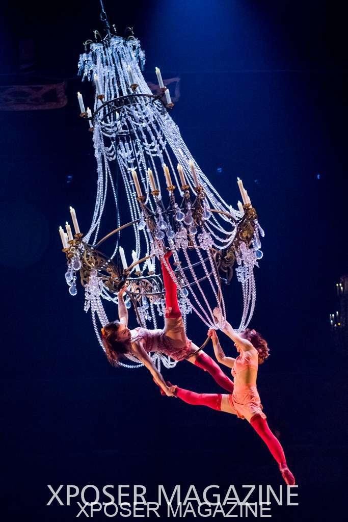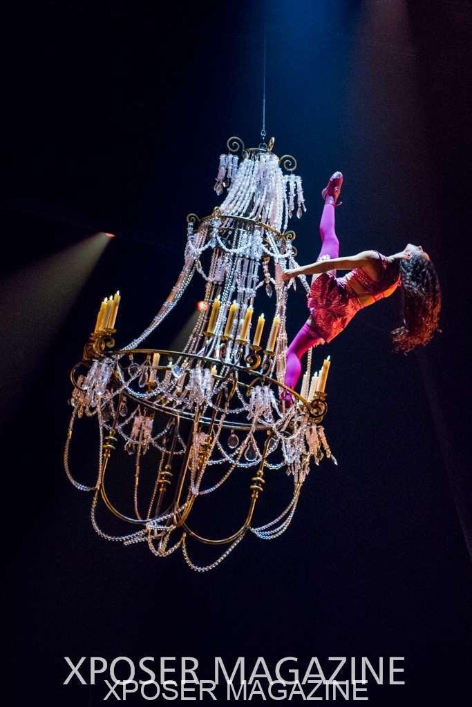 A beautiful ambiance as the curtains draw aside. The clown lays on his deathbed as he sees visions of his past, three chandeliers shimmer from the stage, each one containing a former love of his as he watches them dance from above. This then transitions to a time of his youth where he and his friends were jumping on beds, performing flips and enjoying life as only children do. These are not just ordinary beds however; each one is a specially made trampoline, which also has a hard top cover to allow the hoop artist to perform on top. Each bed weighs approx. 600lbs and there are two of these on stage tonight.