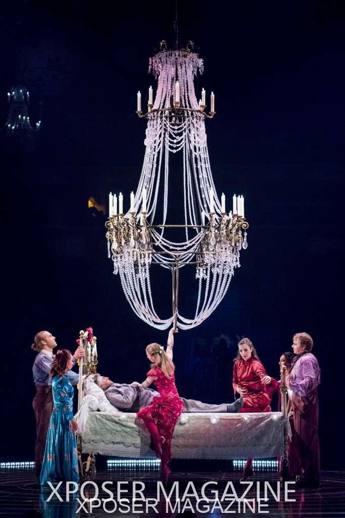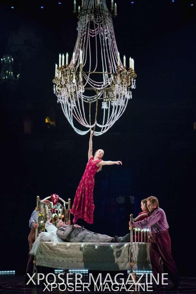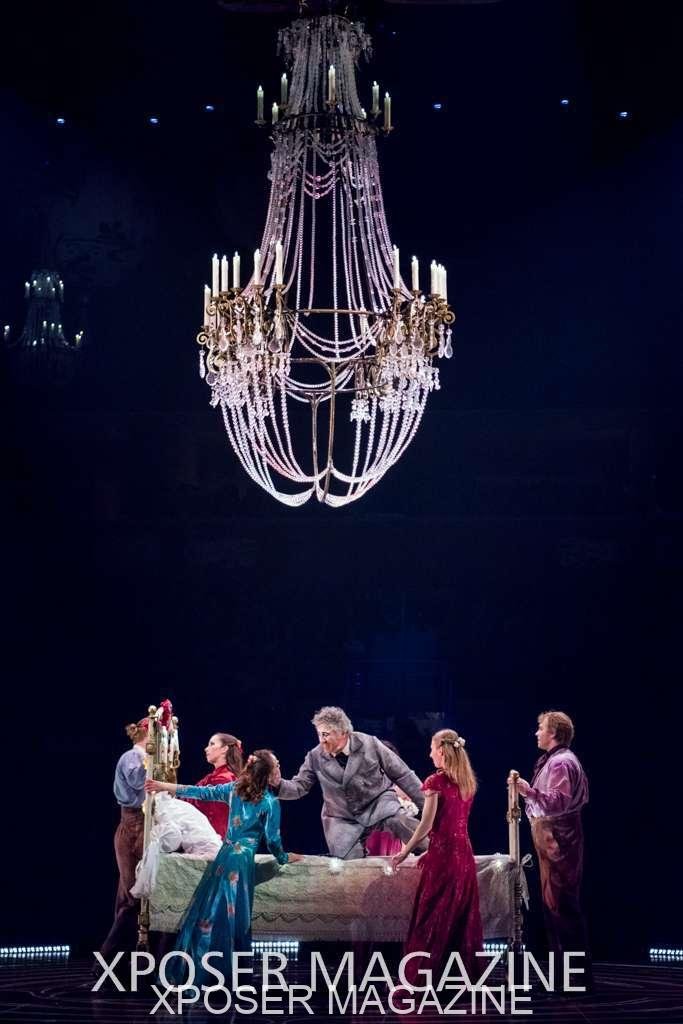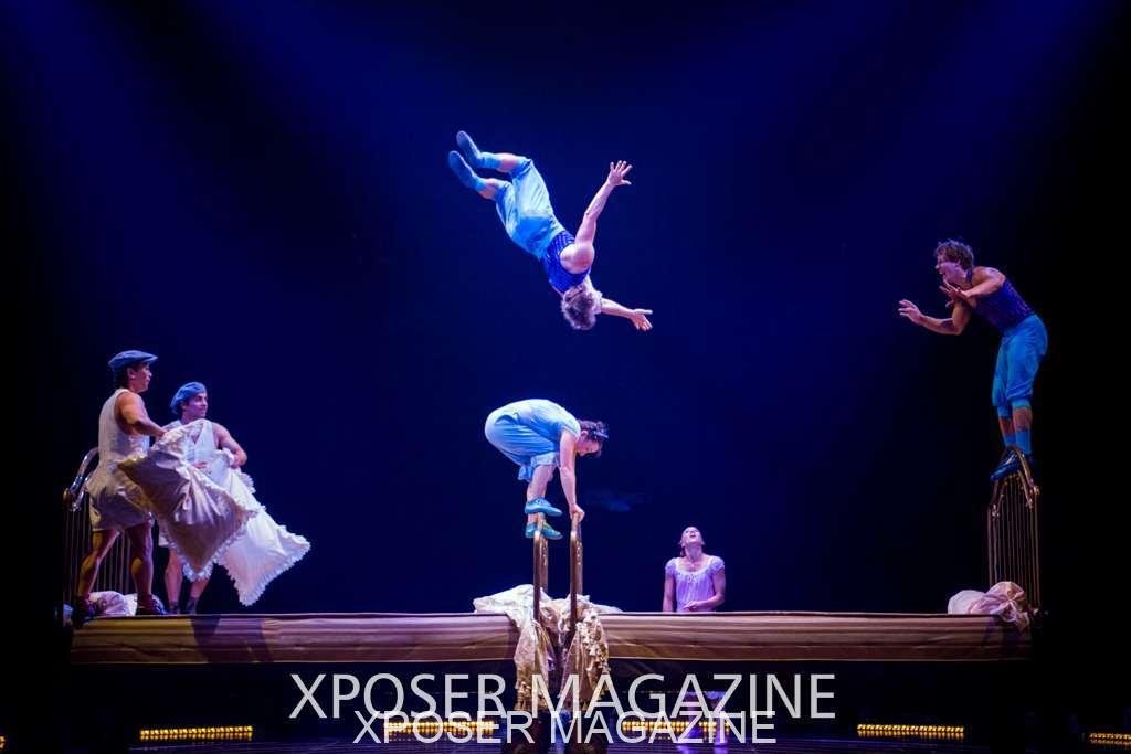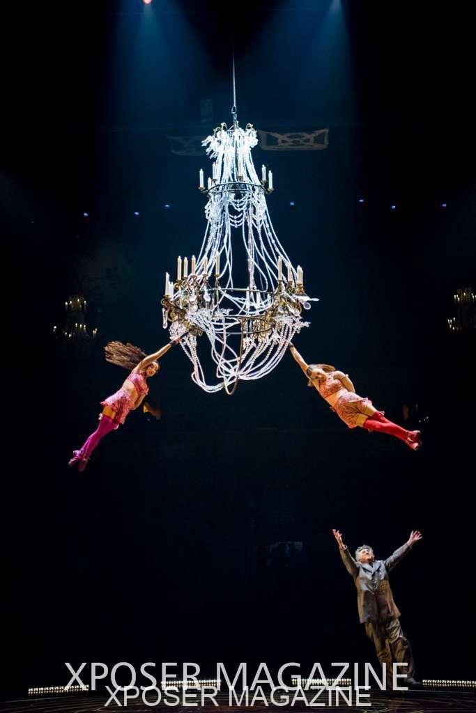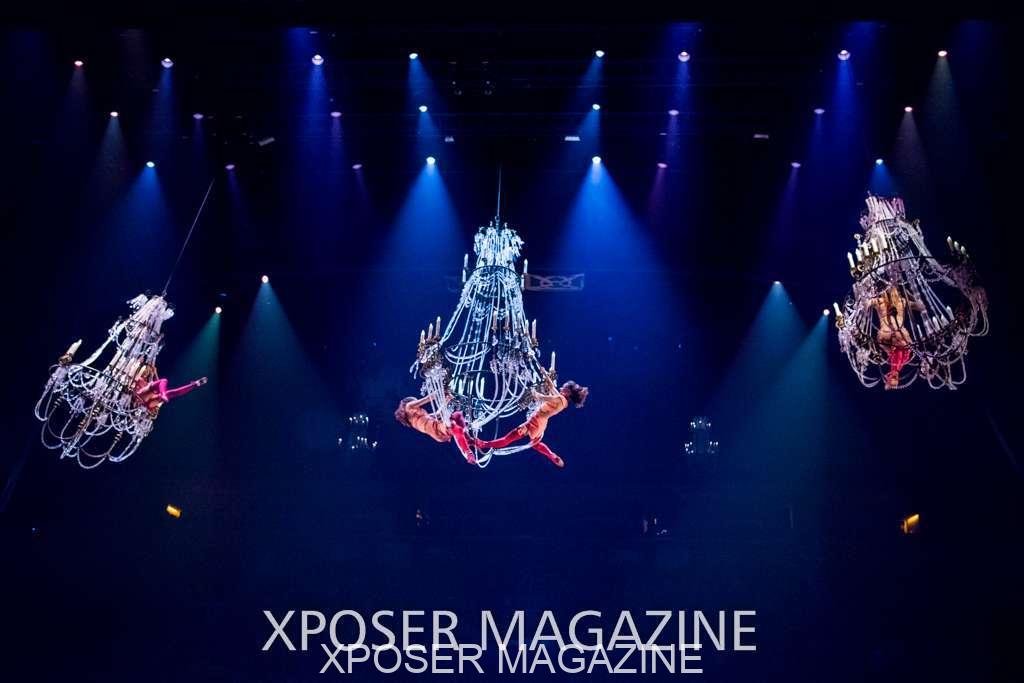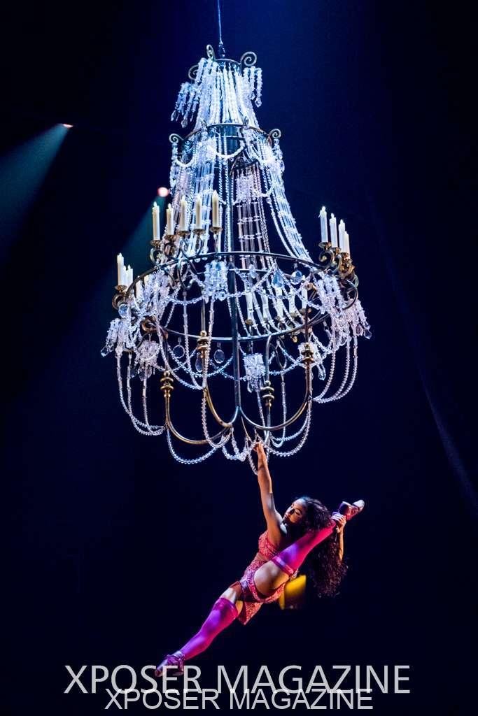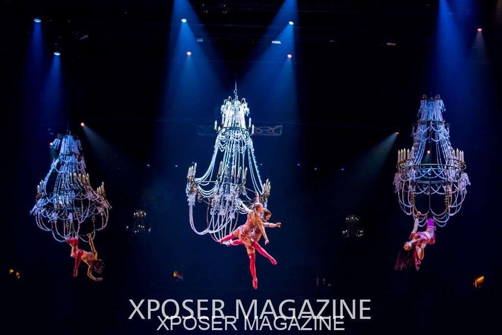 A beautiful ambiance as the curtains draw aside. The clown lays on his deathbed as he sees visions of his past, three chandeliers shimmer from the stage, each one containing a former love of his as he watches them dance from above. This then transitions to a time of his youth where he and his friends were jumping on beds, performing flips and enjoying life as only children do. These are not just ordinary beds however; each one is a specially made trampoline, which also has a hard top cover to allow the hoop artist to perform on top. Each bed weighs approx. 600lbs and there are two of these on stage tonight.
