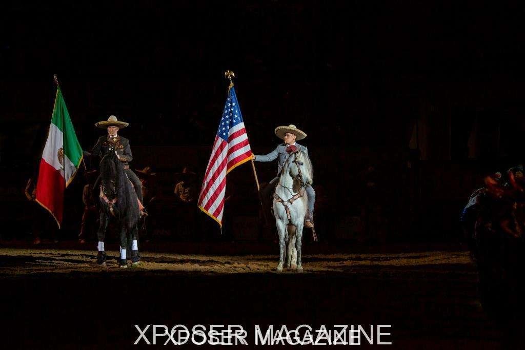 The Mexican Rodeo Extravaganza definitely lives up to it’s name. The show started with Mariachi sol de Mi Tierra songs and dancers. Vibrantly colored and twirling dresses filled the stage while pyrotechnics lit up the arena! Mexican Flags were presented by Escaramuza Charra. The grand entry was quite spectacular to see as the arena instantly filled with dancers, charros and clowns. Local charro groups rode in on their gorgeous high stepping steeds around the outer part of the arena, encircling the group for the presentation of both the Mexican flag and the American flag. The national anthems of both countries were sung by the lovely Valeria Carlos.